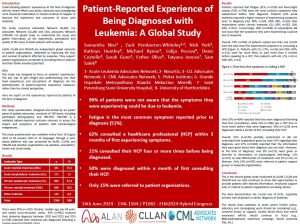 EHA24 poster presentation, with special focus on the Global Study on Patient-Reported Experience of Being Diagnosed with Leukemia (followed by a Caregiver Experience and UK-specific study). The data gathered by the the global leukemia networks (CMLAN, CLLAN and ALAN) through their member organisations are a powerful proof of value of collaboration among patient support groups regardless of their outreach of activities. For some of the organisations operating in small but motivated patient populations the survey has brought valuable data they could not have effectuated alone.