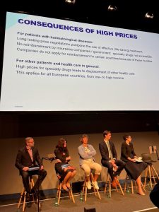 The second session’s topic was Fair pricing – Does the value of new medicines in hematology justify the high price? chaired by prof Frank Leebeek of the Erasmus MC, Rotterdam. He pointed at the challenges of aging population and extension of indications. In the Netherlands, no CAR-Ts are available for multiple myeloma patients unfortunately! Prof. Carin Uyl-de Groot of the Erasmus University in Rotterdam has presented the HTA perspective: potential solutions and future direction by Pay per Performance. How to determine the value is a also a role fot patients! Balanced approach is needed, also to keep up the infrastructure for clinical trials in hospitals.